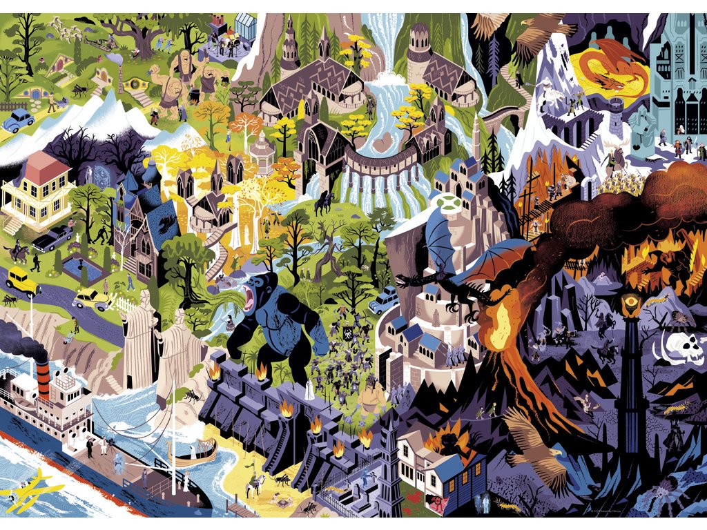 Užijte si skládání 1000 dílků, které odhalí zábavnou a barevnou poctu Jacksonovým kinematografickým dílům!