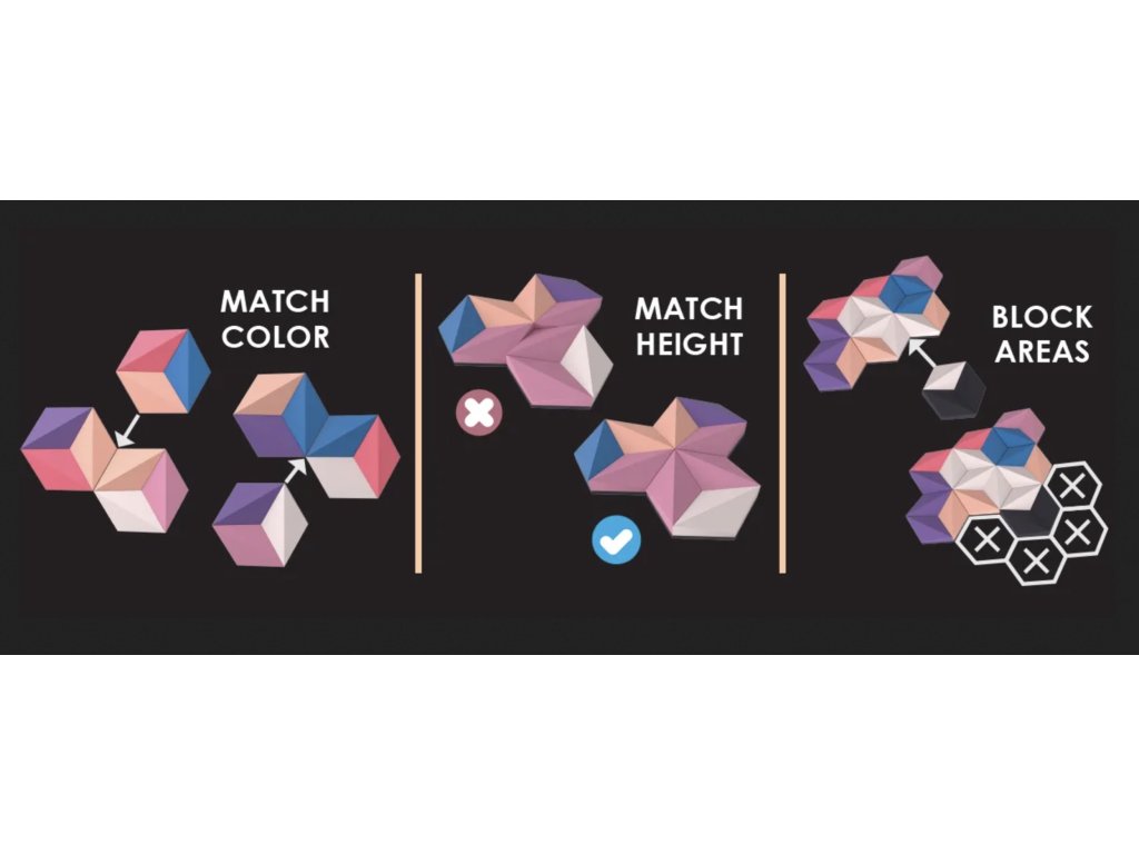Each player takes turns placing their pieces to match both the colour and height of those on the play area. Use blocking pieces to prevent others from placing in adjacent spaces.