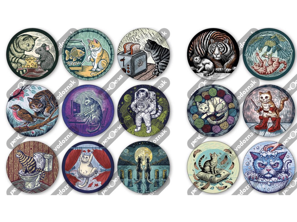 The Playful Cats memory game brings a dose of humour, cuteness, and feline unpredictability. Each card tells a small story from the cat world, combining everyday reality with fantasy. In this round set, you will find 24 pairs with motifs capturing the funniest and craziest moments from the lives of cats – a fat cat standing on a bent scale, another jumping from a collapsing Christmas tree, a hacker cat controlling a keyboard, a brave cat-naut in space, and a cat superhero. The collection includes a poetic touch with two dreamy cats quietly watching a giant moon.