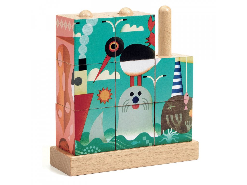 Krásné dřevěné stohovatelné puzzle s obrázky mořských zvířátek, které děti seskládají pomocí dřevěných vodících kolíčků. Děti mohou seskládat čtyři obrázky v krásných ilustracích moře.