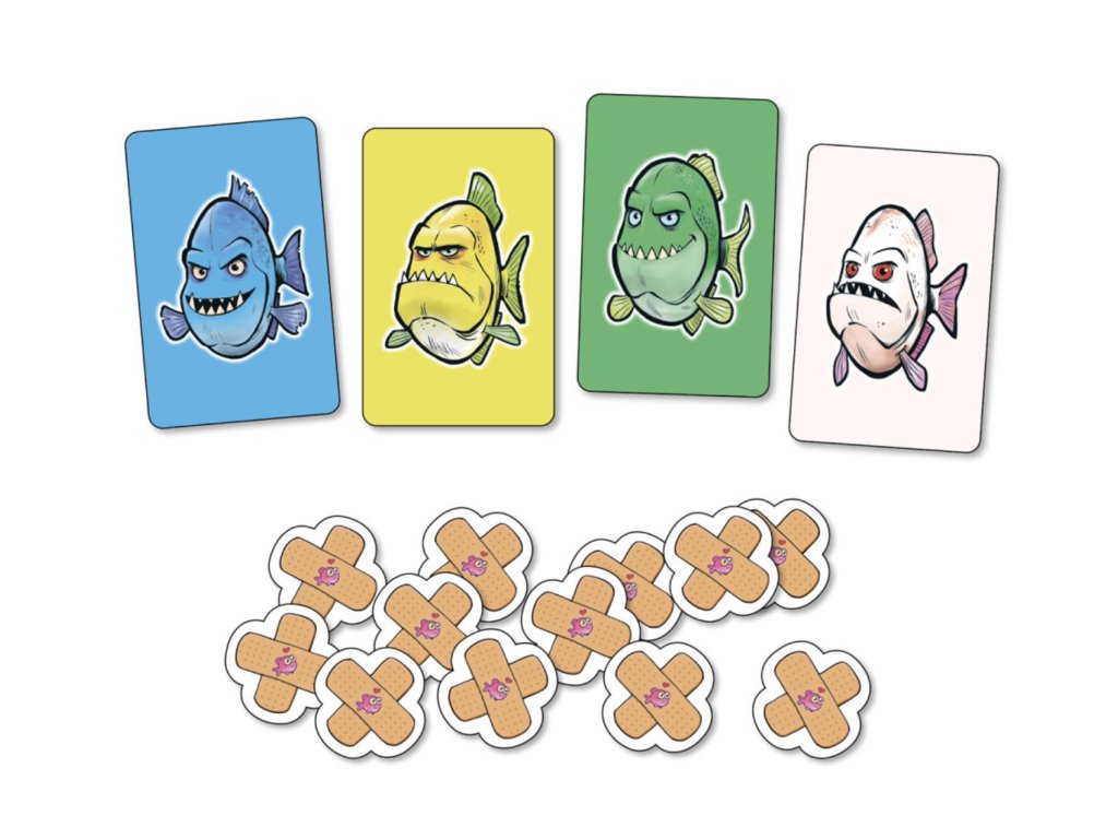 Box Contents: 36 double-sided piranha cards, 4 protective cards for cooperative play, 25 bandage tokens.