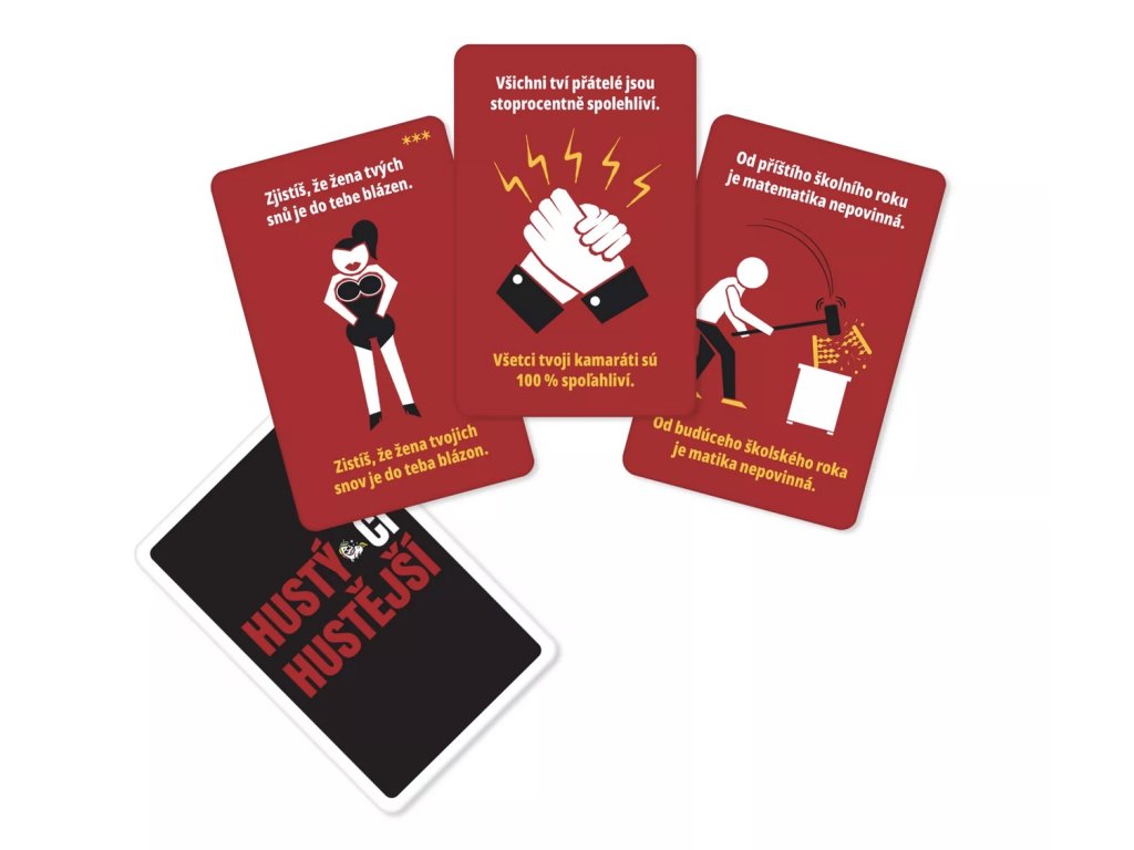 Hustý či hustější is a politically incorrect party game for adults based on the paradox of human indecision. Would it be better if you owned anything you peed on, or if you could be invisible? This game is full of unexpected dilemmas that might surprise you when you find out what your friends actually consider "cool."