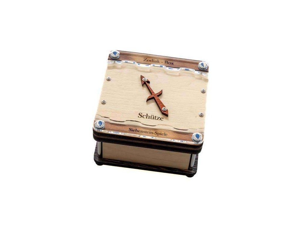The Zodiac trick box – Sagittarius is a handcrafted wooden puzzle. Each of the twelve zodiac signs conceals a different internal labyrinth – no two boxes open the same way.