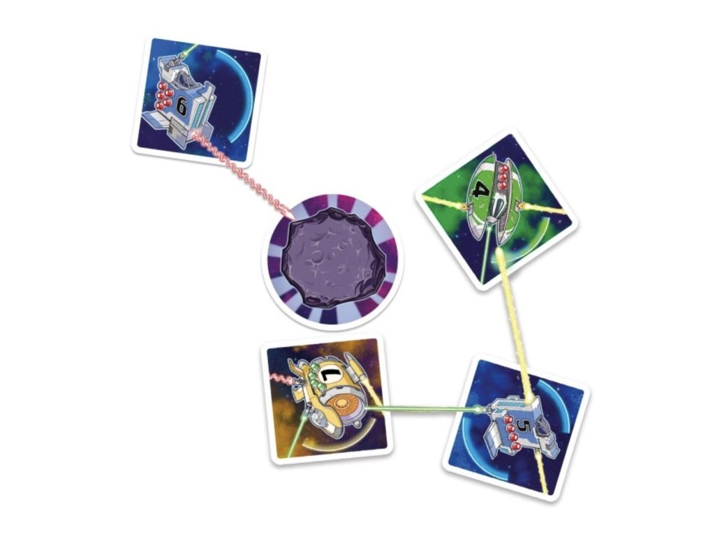 Deploy your ships before time runs out The entire game plays out in real-time. The companion app starts the countdown, and during short intervals, all players simultaneously deploy their ships into the arena. Where will you aim? At enemy fleets, mineral-rich asteroids, or toward defending your own base? The position and rotation of each ship determine exactly where its laser beams strike and where its shields protect.