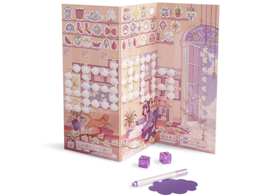 Daydream is a cozy roll-and-write game where everyone plays simultaneously, filling in their cloud grid with numbers determined by the roll of 2 dice.