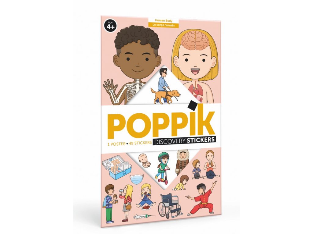 Vzdělávací plakát (1 m x 68 cm) + 49 samolepek. Plakát vytištěný na obou stranách (1 strana ve francouzštině, 1 strana v angličtině). Velký vzdělávací plakát lidského těla doplněný o přemístitelné samolepky. Dítě nalepí na plakát 49 velkých samolepek podle uvedených čísel. Objevuje tedy fungování lidského těla. Plakát uvádí jména nejznámějších orgánů a kostí. Originální vzdělávací hra pro učení a zábavu, kterou ilustroval korejský ilustrátor Woo Joo Jang.