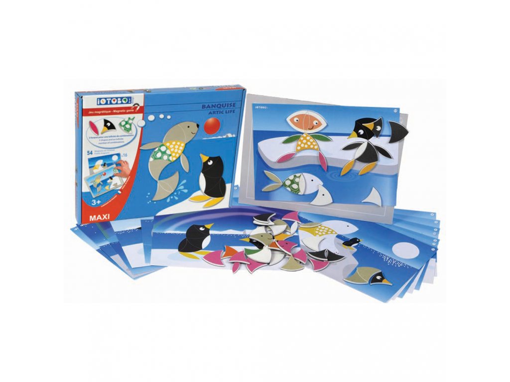 Magnetická kreativní MAXI skládačka s pěnovými magnetkami, v níž si dítě na arkticky laděných tématických předlohách skládá "Eskymáků, Tučňáků, Polárních medvědů, a jiné výjevy zpoza polárního kruhu".