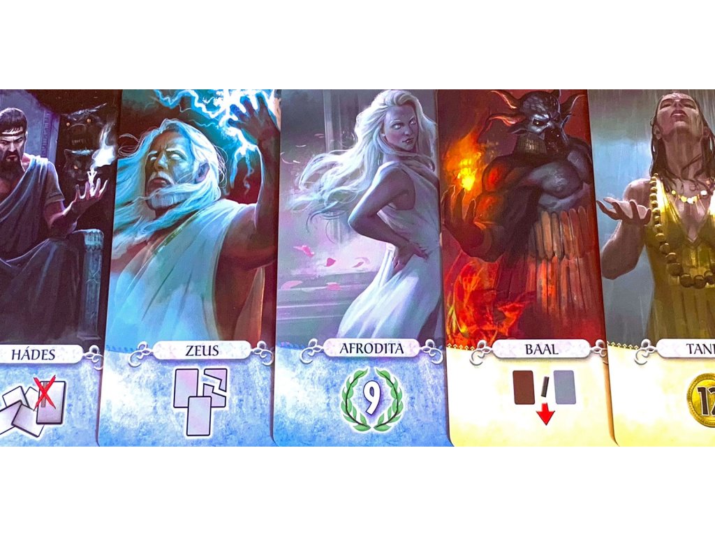 Obsah balení: 1 deska panteonu, 15 karet božstev, 1 karta brány, 5 karet velkého chrámu, 2 karty divů, 10 žetonů mytologie, 3 žetony obětin