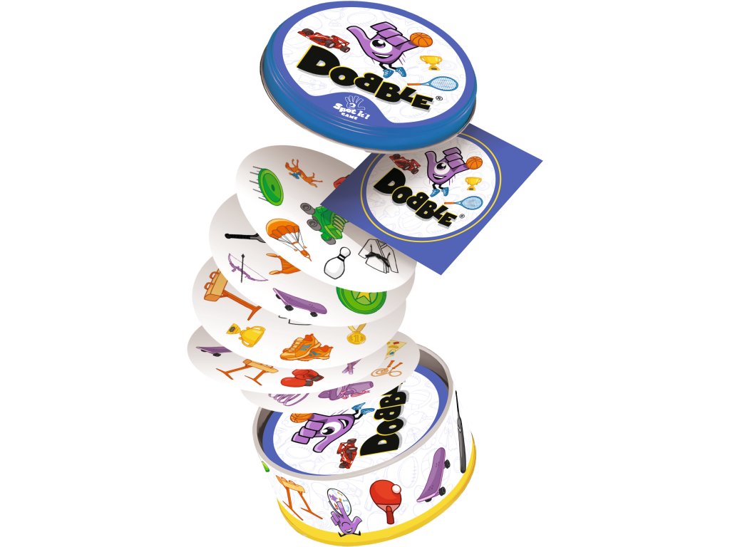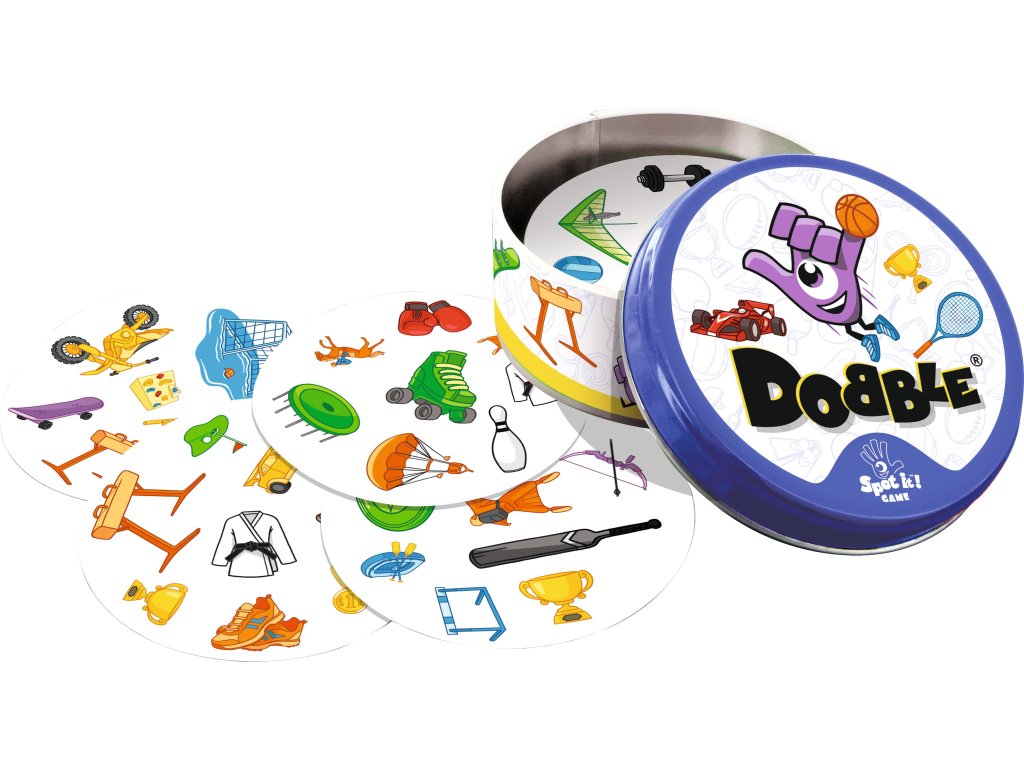 Postřehový fenomén Dobble vstupuje do světa sportu! Na každé z kulatých karet najdete 8 tematických obrázků. Máte rádi sport? Buďte první, kdo pojmenuje společný symbol mezi dvěma kartami – ať už jde o fotbal, tenis, plavání, paragliding, lezení, nebo jiné aktivity!