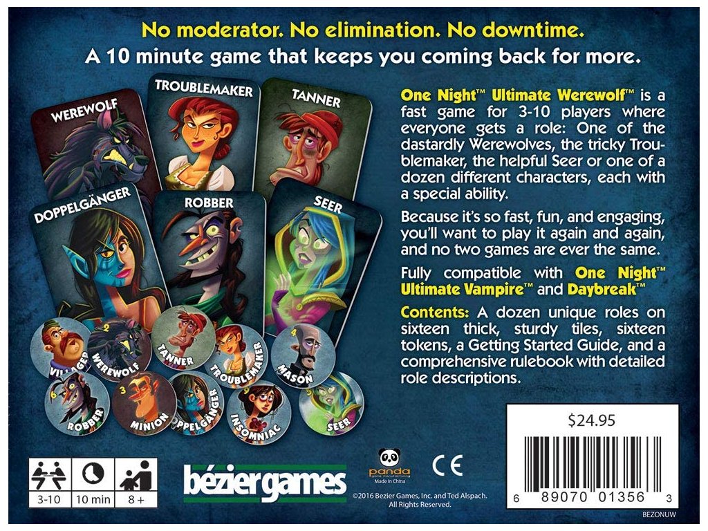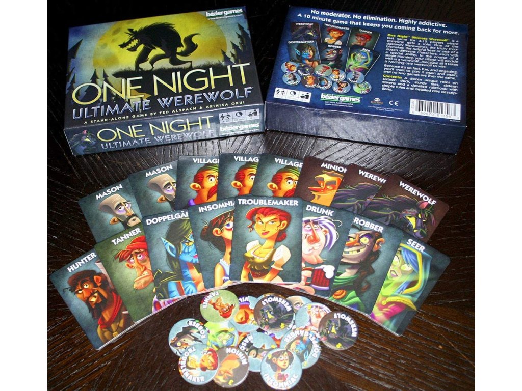 One Night Ultimate Werewolf je rychlá a napínavá hra pro 3-10 hráčů, kde každý získá jednu z unikátních rolí: můžeš být jedním z nebezpečných vlkodlaků, mazaným Troublemakerem, nápomocným Věštcem nebo jedním z mnoha dalších postav, každá s vlastní speciální schopností. Během jednoho rána se vaše vesnice musí rozhodnout, kdo je vlkodlak, protože stačí zabít jediného vlkodlaka, aby se dosáhlo vítězství. Hra je plná lží, podvodů a strategických rozhodnutí, ideální pro všechny, kteří mají rádi napětí a zábavu ve společnosti přátel.
