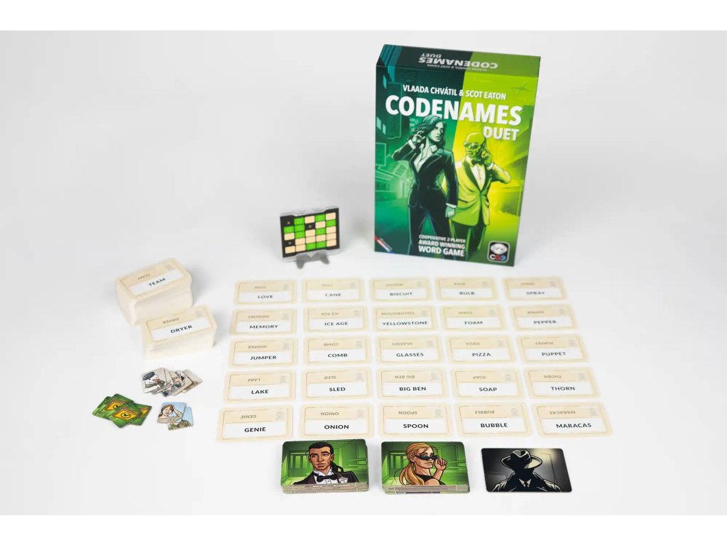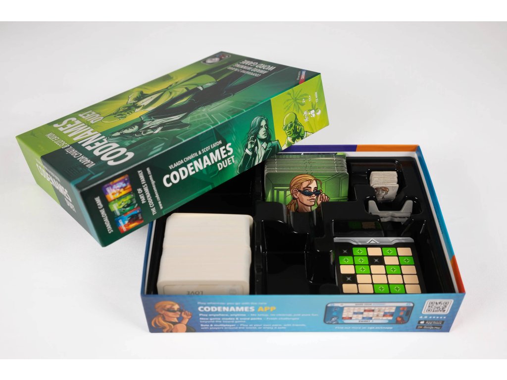 CODENAMES: Duet přináší zcela nový kooperativní zážitek ze světa Codenames. Tentokrát proti sobě nebojujete – naopak, spolupracujete jako tým tajných agentů, kteří se snaží odhalit všechny své spojence dřív, než vyprší čas… nebo než narazíte na nájemného vraha.