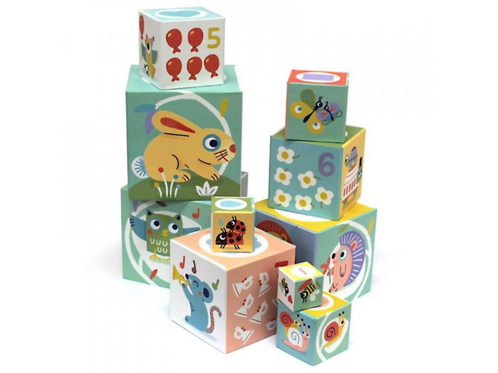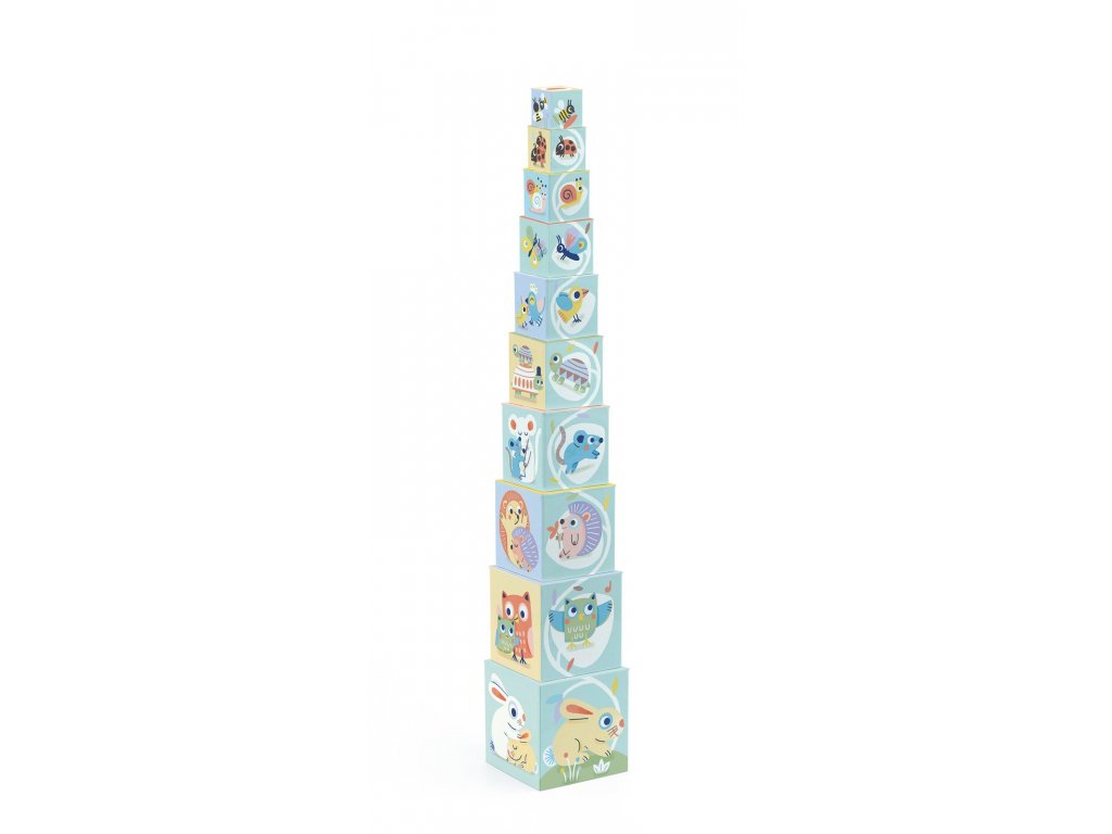 Krabičková věž Obrázky Djeco obsahuje 10 kostek z kartónu s obrázky lesních zvířátek, ze kterých děti postaví vysokáááánskou (86 cm) věž. Pro děti od 12 měsíců. Rozměry...