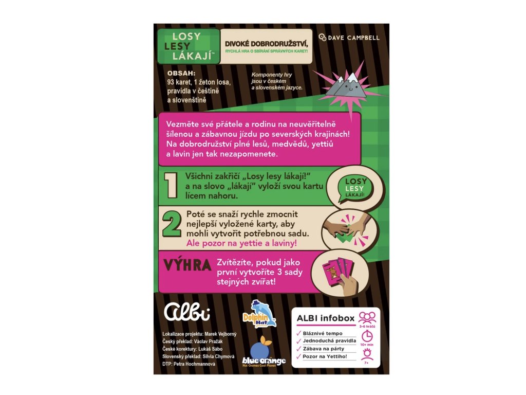 Jak se hraje? Všichni společně zakřičí: „Losy lesy lákají!“ a přesně na slovo „lákají“ vyloží svou kartu lícem nahoru. V tu chvíli začíná mela! Musíte se co nejrychleji zmocnit té nejlepší vyložené karty, abyste doplnili svou sadu. Ale pozor – yetti a lavina vám mohou plány v mžiku překazit!