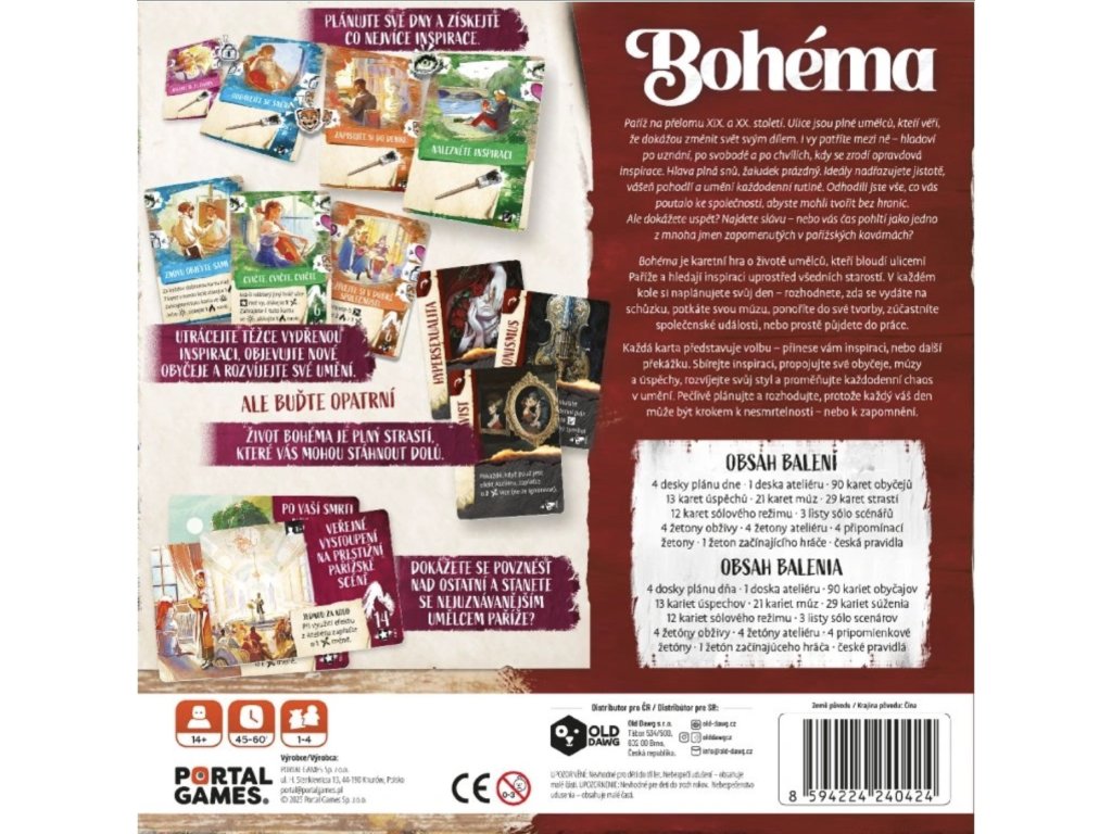 Bohéma spojuje nádherné výtvarné zpracování s atmosférou doby, kde se romantika střetává s drsností pařížských ulic. Nabízí přístupná pravidla, ale hluboký prostor pro strategii. Každý balíček vypráví jiný příběh – kombinace tématu a emocí dělá z každé partie jedinečný zážitek.