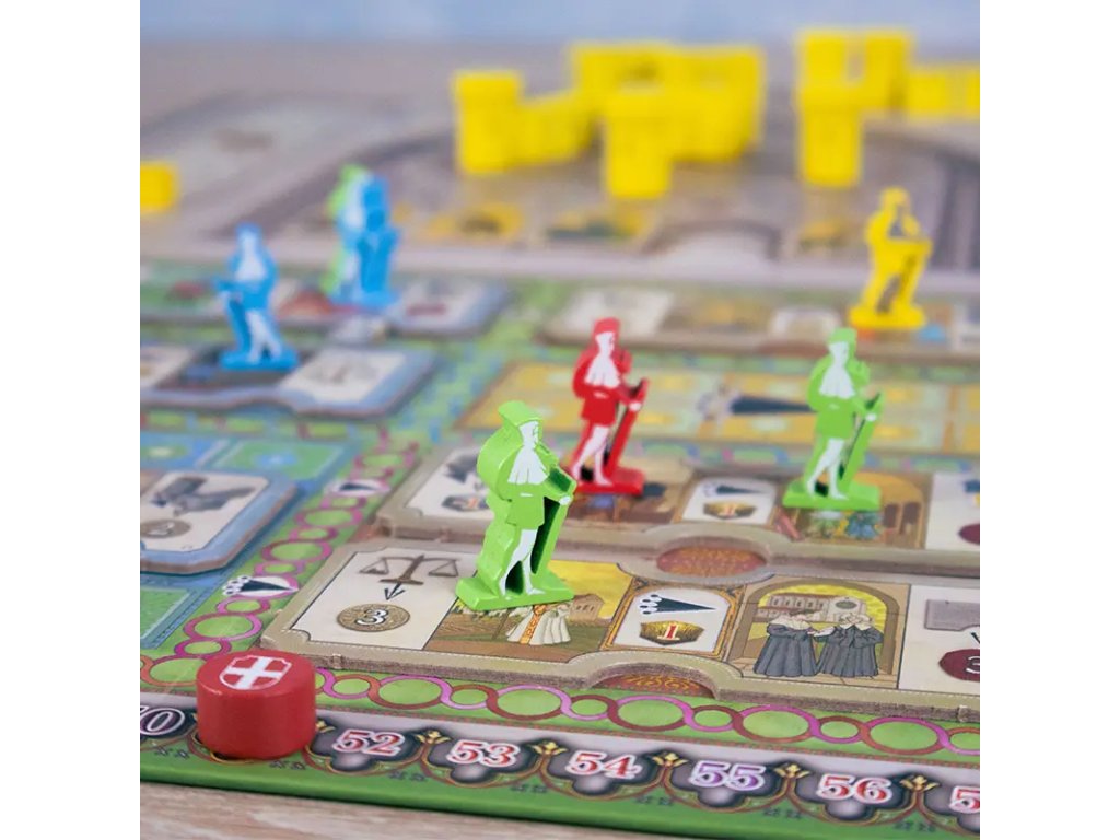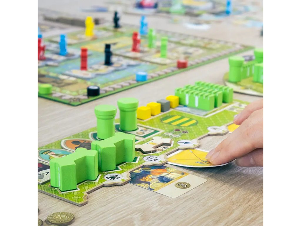 Zdroje a žetony: 40× Kostka surovin, 45× Mince, 94× Různé žetony, 12× Krycí destičky.
