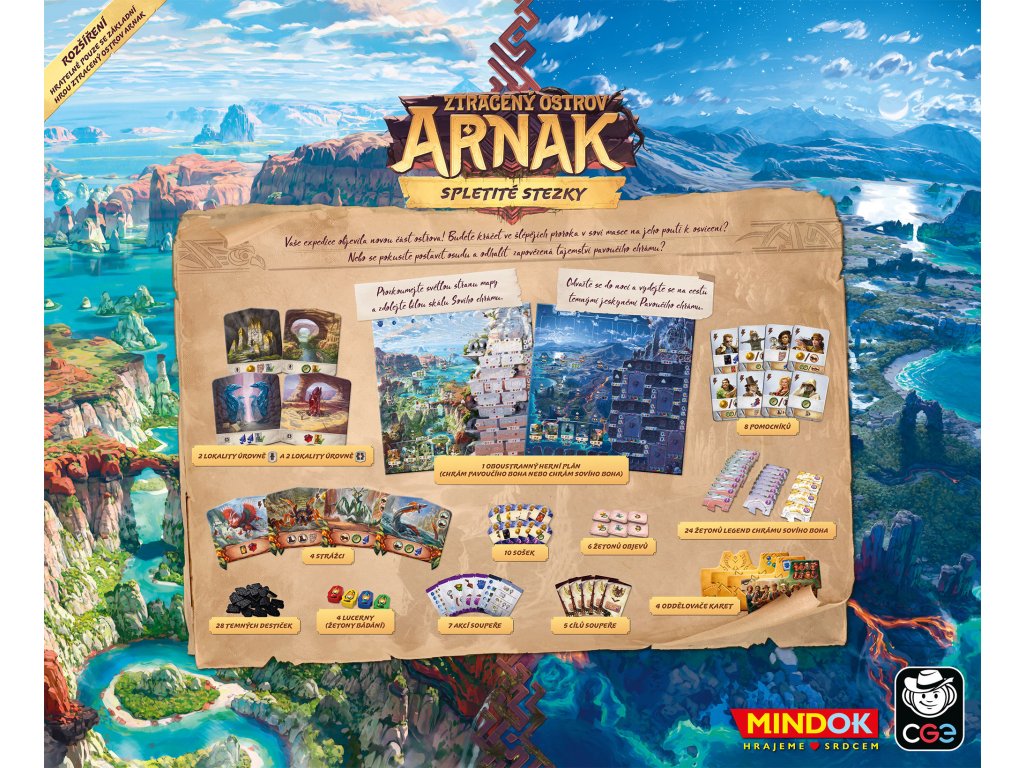 Připravte se na ultimátní výpravu! Spletité stezky jsou dosud největším rozšířením pro hit Ztracený ostrov Arnak. Přináší oboustrannou herní desku, která je dokonce větší než v základní hře, a nabízí dvě zcela nové výzkumné stupnice s unikátními mechanismy. Vstupte do chrámů, které dosud nikdo nespatřil, a odhalte tajemství ukrytá v hlubinách ostrova.